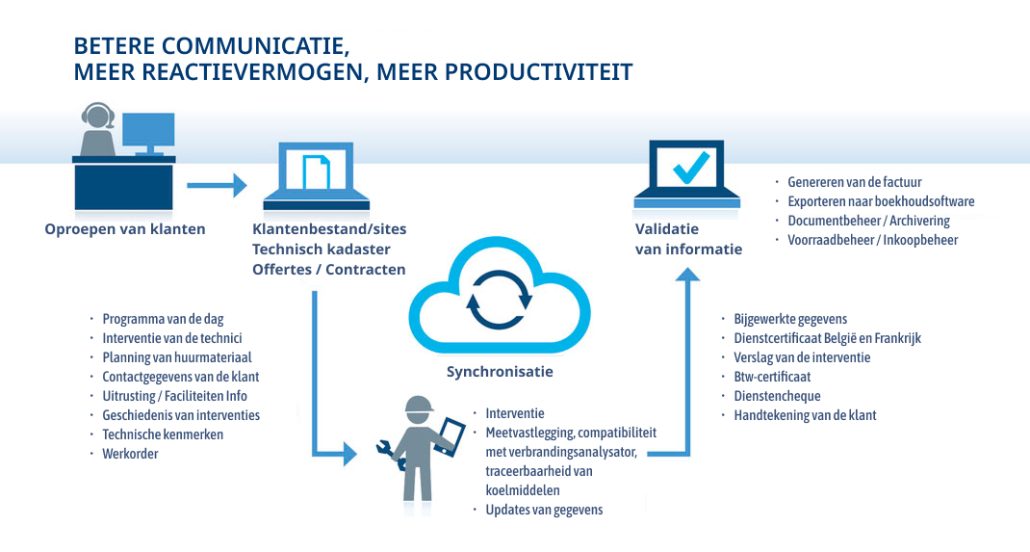 Uw technieker verbonden via zijn tablet, van de planning tot het uitlezen van de verbrandingstoestellen tot het interventierapport
